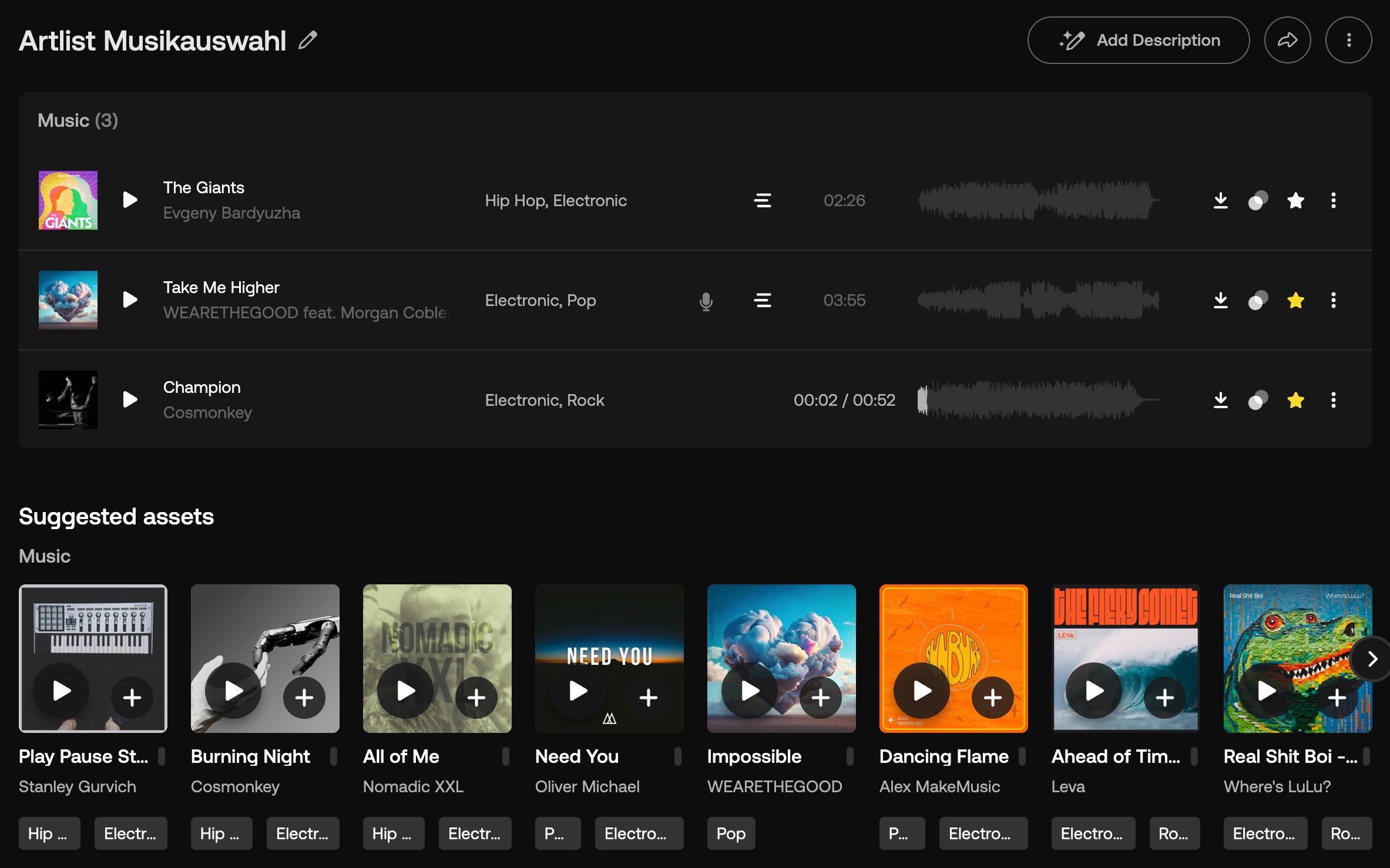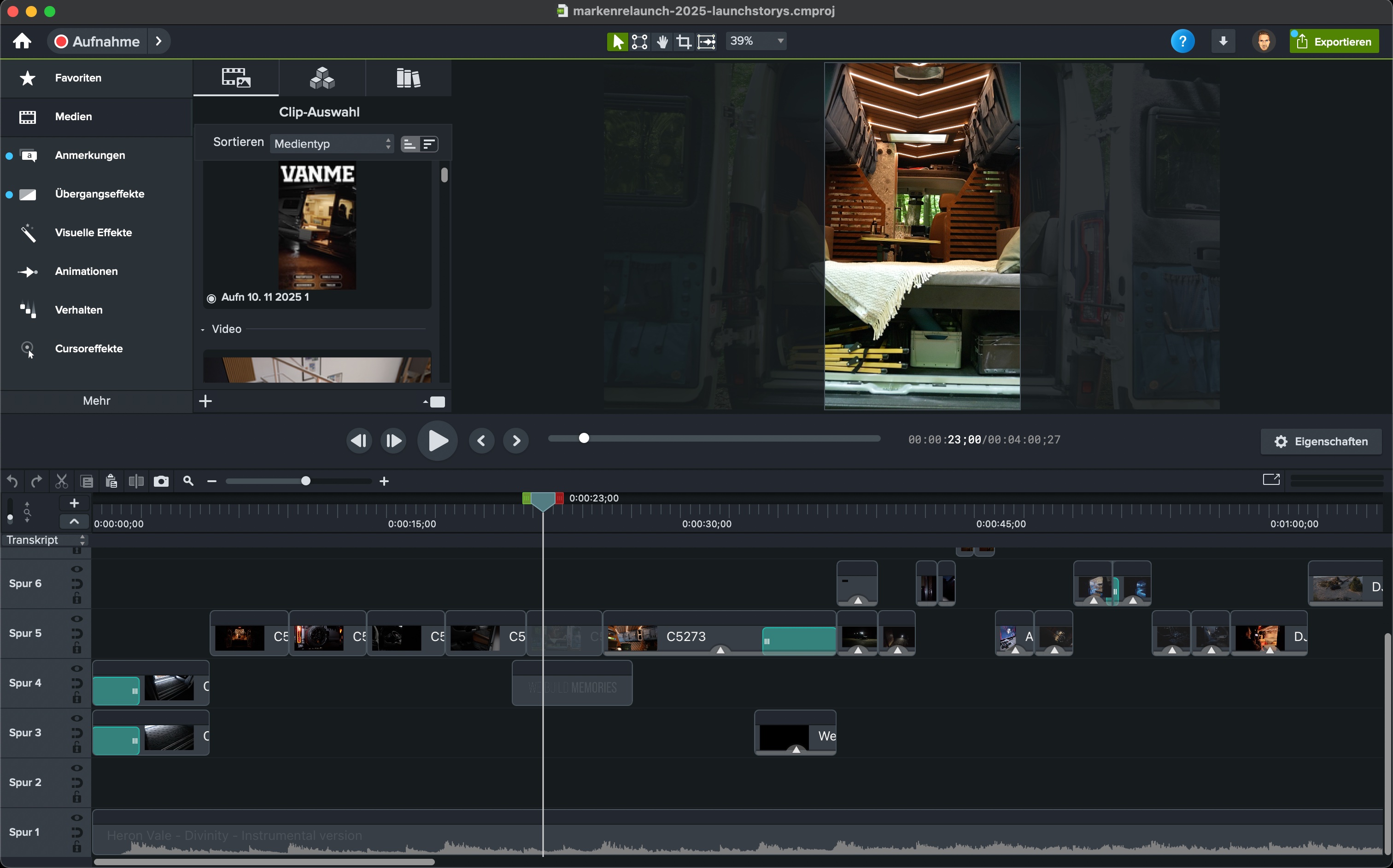 Aus dem gedrehten Material wählen wir die besten Takes und legen die Hintergrundmusik fest. Schnittrhythmus und Soundtrack müssen zusammenpassen – deshalb steht die Musik, bevor der finale Schnitt beginnt.