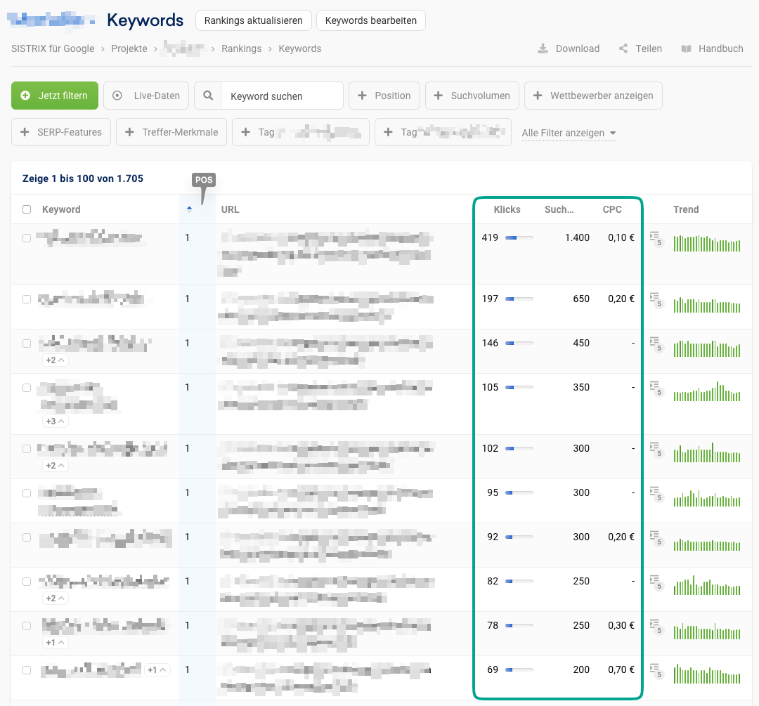 Wir überwachen die organische Suchposition der vereinbarten Keywords mit SISTRIX und führen – wo es sich lohnt – fortlaufend SEO Optimierungen durch. Wichtige Keywords die auch SEO nicht direkt ansprechen werden per Google Ads attackiert.
