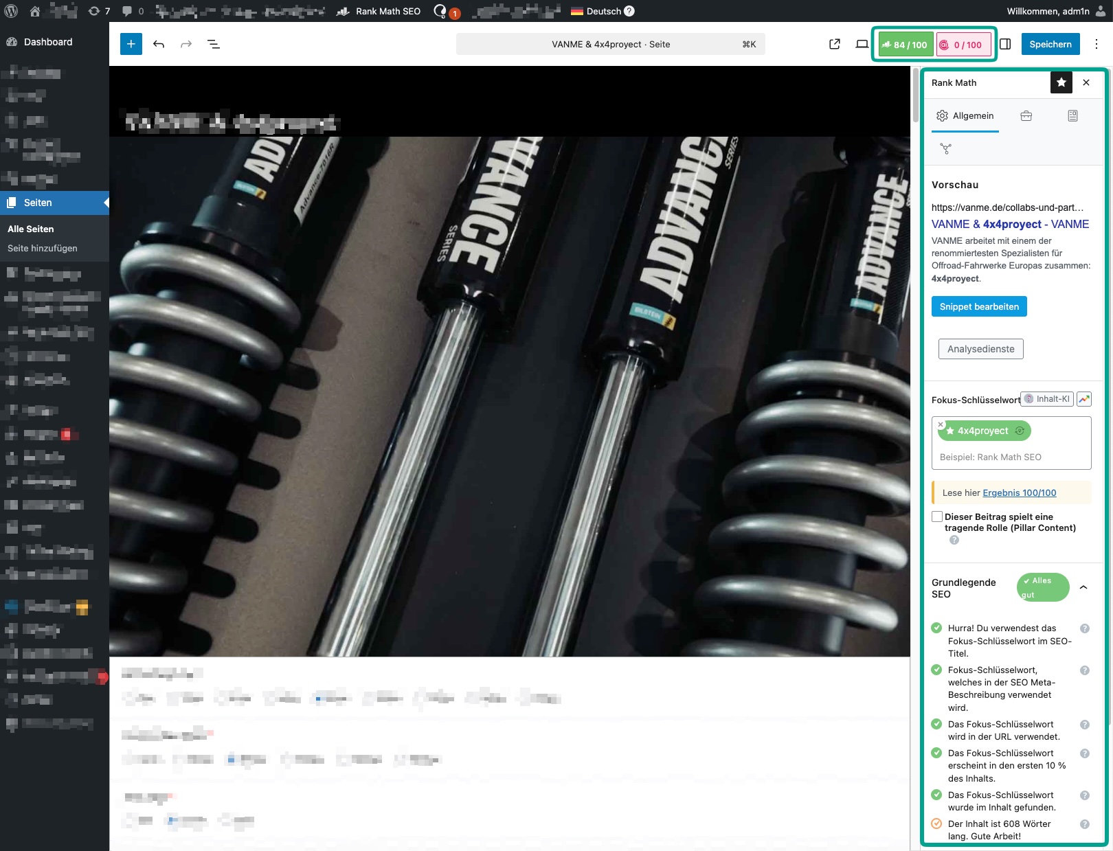 Wir nutzen das Rank Math SEO Pro Plugin für WordPress, u.A. zur Visualisierung der Keyword Optimierung der Seiten & Beiträge. Je nach Kundenwunsch optimieren wir, oder deine Mitarbeiter deine Inhalte nach SEO Best Practices.